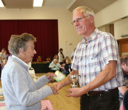 Rob Harvey’s breadmaking is first class. His pear tarts and sausage rolls are also worthy of prizes, as Rob proved on Saturday when he became the first man to win the Horticultural Society’s Cup for home produce at the Autumn Show. He is pictured receiving it from society president Beryl Denham.