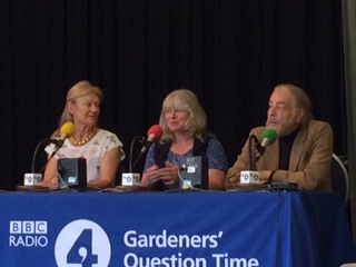 Bunny Guinness, Anne Swithinbank and Bob Flowerdew, the Gardeners’ Question Time panel above, recorded TWO episodes of this much-loved gardening programme at Uplyme Village Hall on 31st May. As guests of the Uplyme and Lyme Regis Horticultural Society they answered questions from a full-house audience with their usual expertise and wit.