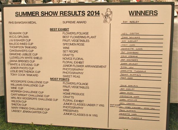 flowers/foliage to Jane Garland; Williams Challenge Cup for fruit/vegetables to Roy Keeley; Wine Cup to John Wood; Morrish Challenge Cup for home produce to Henriette Wood; Cartwright Challenge Cup for crafts to Carol Stickler; Mrs Reg Woodroffe Challenge Cup for floral exhibit to Neil Croton; Wilson Cup for junior classes (under 7 years) to Sophia Williams, Isabel Wiscombe and Simon Law; Shilton Cup for photography to Penny Duffield; Mary Frings Challenge Cup for preserves to Henriette Wood; Lindsey Jenkin-Carter Cup for junior classes (8-14 years) to Charlotte Tweedale.